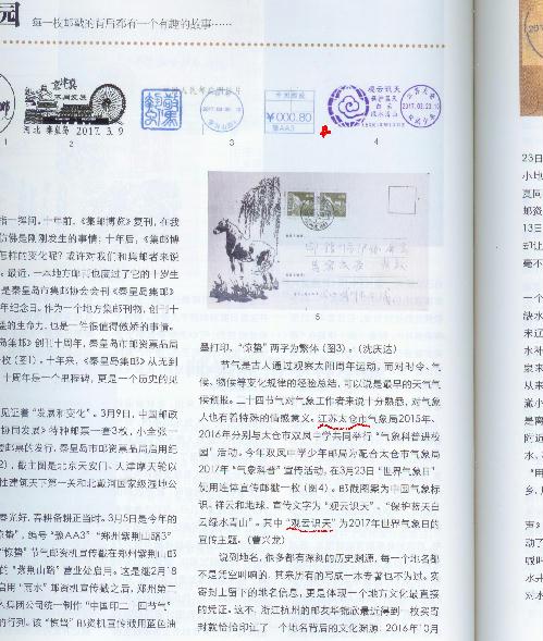 ? ? 2017年《集邮博览》第四期第60页“戳趣园”中,指导老师撰写双凤少年邮局使用的气象日连体邮戳短文发表,让全国集邮爱好者了解这枚邮戳上的知识,为气象局宣传2017年气象日主题“观云识天”作出贡献。这枚气象邮戳是2017年气象日全国唯一的宣传邮戳,专题信息强,一定会受到气象专题集邮爱好者的追寻。